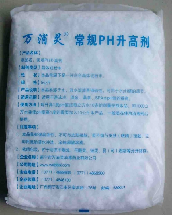 常規(guī)PH升高劑,堿含量大于98%。片堿、燒堿,提高水的PH值。5KG/包*4包/箱。每升高1度PH值按每立方水10克,即1000立方水搞高1度PH需要加入本品10KG。一般在使用萬消靈消毒劑后使用。